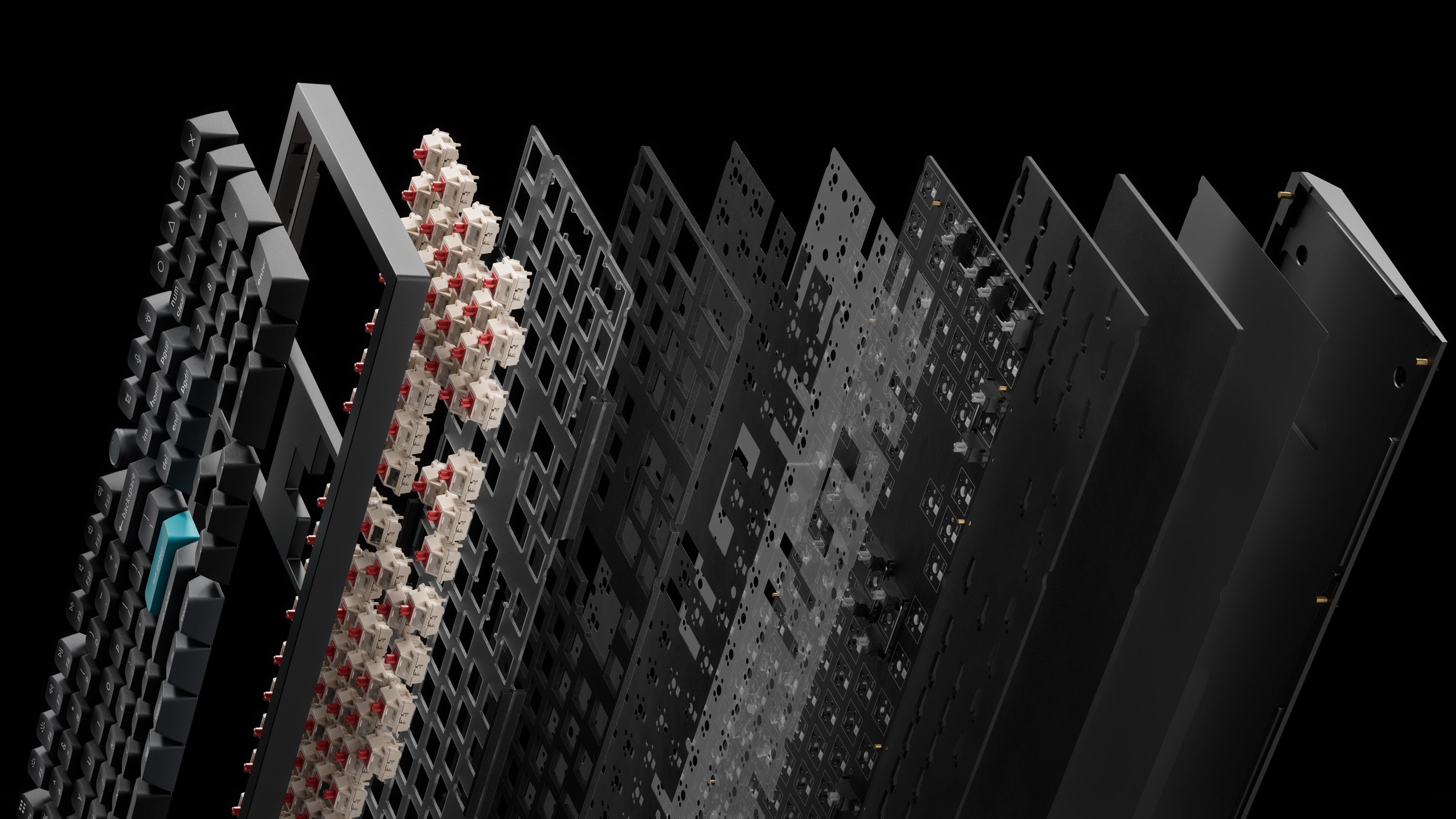 - The keyboard PCB, the case, and the PC plate.