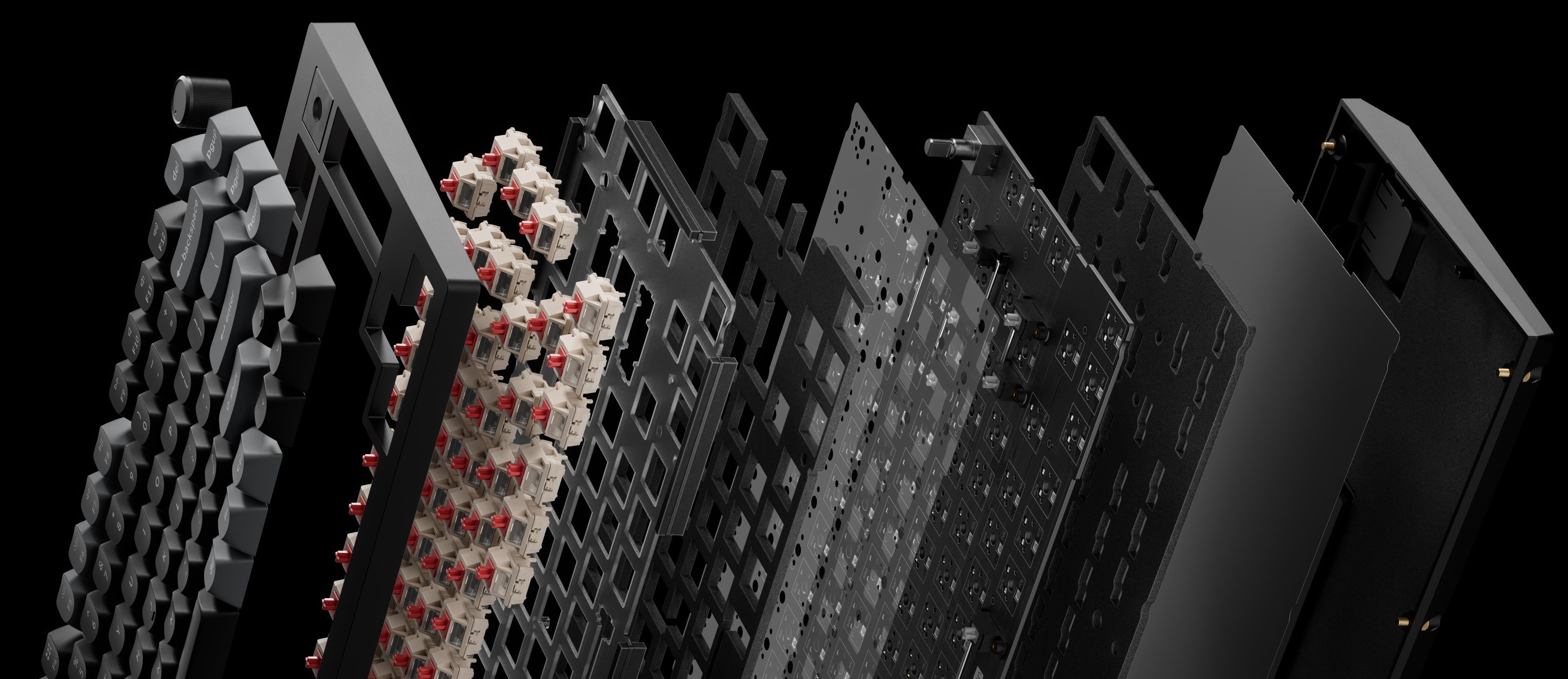 - The keyboard PCB, the case, and the PC plate.